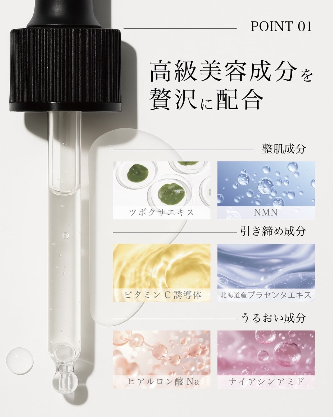 年齢を重ねて、肌のハリ、つや、弾力、シミ、シワ、それぞれの悩みが複合的になってきました。 様々なアイテムに出会い一時的にお肌がきれいになることがあってもなかなか継続しない。 そんな中、しっとりモチモチになるのはもちろんのこと、本気で肌の土台作りができる美容液を作りたいと思いました。